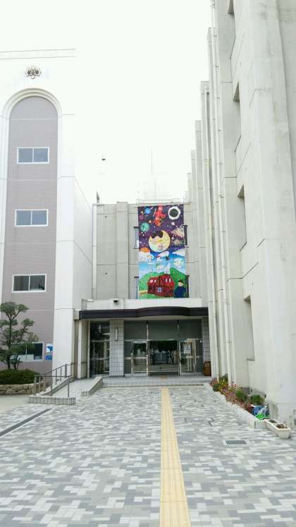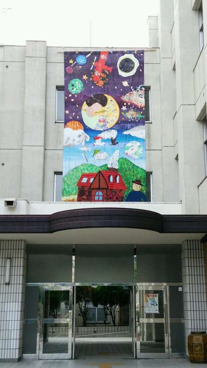 本日、美術部の巨大壁画作品が完成しました。玄関上の屋上から立て7メートル、横3メートルの傑作です。テーマは、『宇宙の晴れ間』。