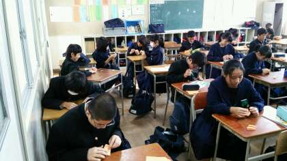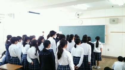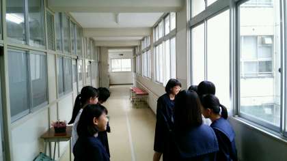 2年生では、学年合唱コンクールに向けて、廊下でパート練習中でした。また、教室では平和をテーマにした作品づくりに取り組んでいます。