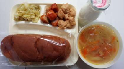 本日の献立は、黒糖パン、まぐろのオーロラ煮、スープ、サワーキャベツです。