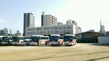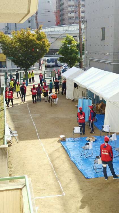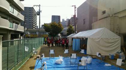 今日は『大阪マラソン』が開催されています。本校の東側道路は、そのコースになっており、20km地点の本校には救護所が設けられています。早朝からスタッフがその準備に当たっていました。
