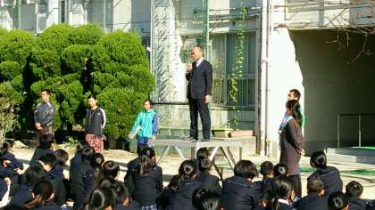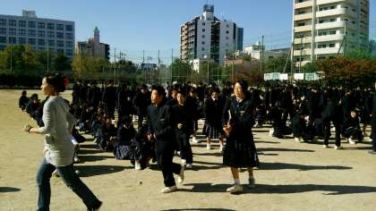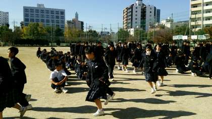 運動場で全員の安全を確認したあとは、大阪湾からの津波を想定して、安全な校舎の最上階へ隊をなして移動しました。