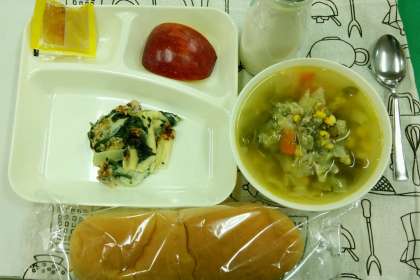今日のメニューは『鶏肉と野菜のスープ煮』と『りんごほうれん草のグランタン』でした。グランタンを見て大喜びの生徒たち。