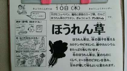 冬場のほうれん草はビタミンC豊富で、これからの寒い時期、体調不良や風邪引きなどの対策として、積極的に摂りましょう。本日はほとんど残食なしです。