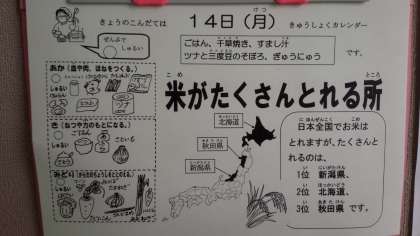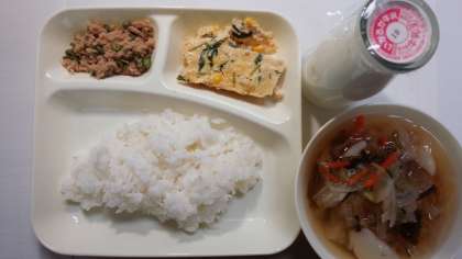 本日の献立は、千草焼き、ツナと三度豆のそぼろ、すまし汁です。