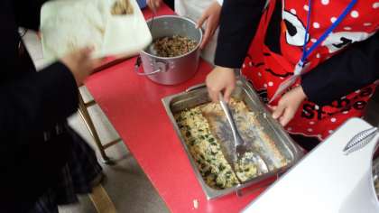 四角い鍋に入っている千草焼きに切れ目を入れて、上手に等分によそい分けていました。