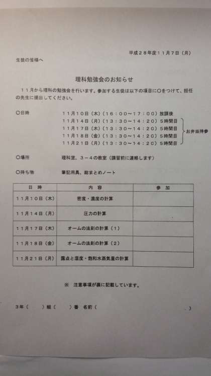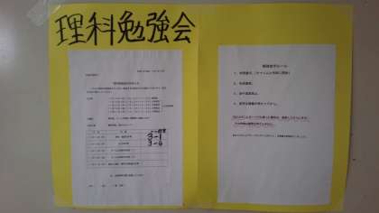 なお、時間・場所については、変更される場合がありますので、そのつど、理科の大西先生に問い合わせてください。