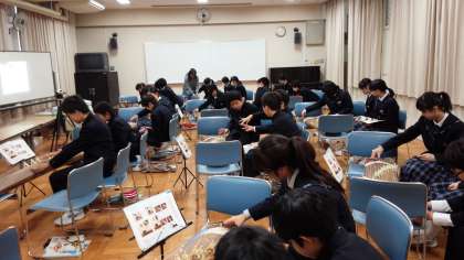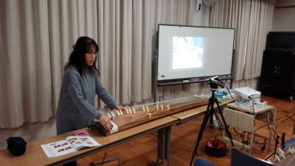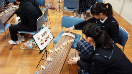 そして、いよいよ生徒たちが演奏します。初めて触れるお琴に、最初は恐る恐るですが、生徒たちは興味津々です。