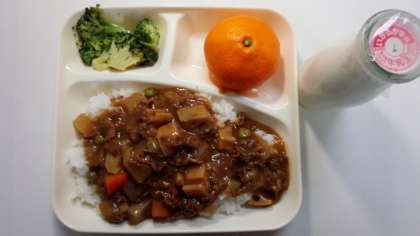 本日の献立は、冬野菜のカレーライス、ブロッコリーのサラダ、みかんです。