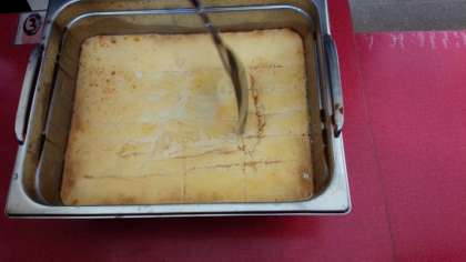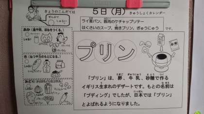 各クラスとも、給食係が切れ目を入れて焼きプリンを等分に分けていました。
