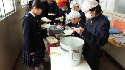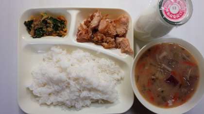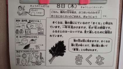 本日の献立は、鶏肉の甘辛焼き、さつまいものみそ汁、きくなとはくさいのごまあえ、です。