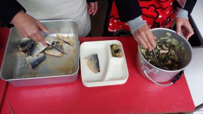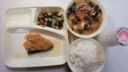 本日の献立は、さばのみぞれがけ、おおさかしろなの煮びたし、みそ汁です。