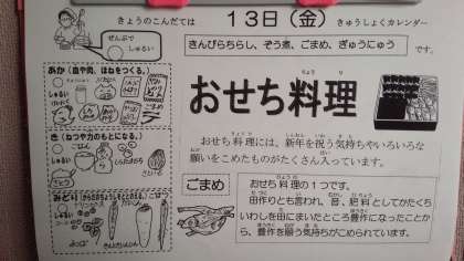 本日の献立は、きんぴらちらし、おぞう煮、ごまめ、のお正月メニューでした。