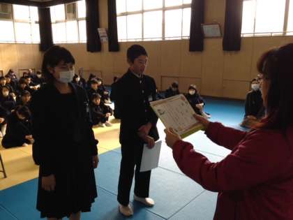 先日行われた2年生の百人一首大会の結果発表と表彰がありました。