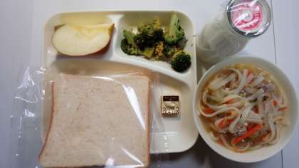 本日の献立は、五目うどん、ブロッコリーのごまあえ、りんご、食パン、バターです。