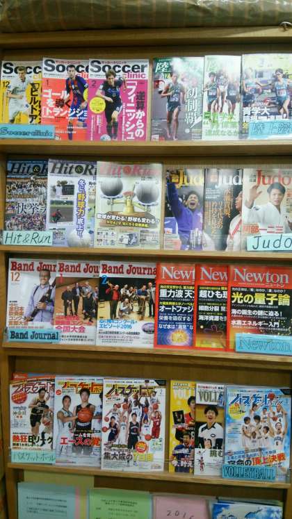 図書館にはスポーツ雑誌もたくさん揃っています。自分の所属する部活動や、興味のあるスポーツ等、昼休み等ご利用ください。