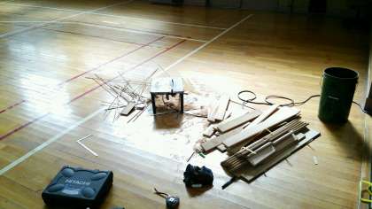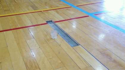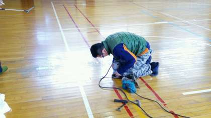 2月6日(月)〜8日(水)期間で体育館フロアーの一部張替等の工事を行っております。プロの手際い良い、正確な作業でかなり部分の張替がスムーズに進んでいます。