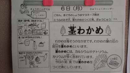 本日の献立は、まぐろのしょうゆマヨネーズ焼き、茎わかめのつくだ煮、とうふのみそ汁です。