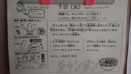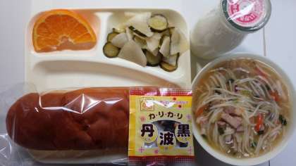 本日の献立は、チャンポン、ピリ辛あえ、いり黒豆、黒糖パン、いよかん、です。