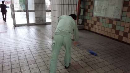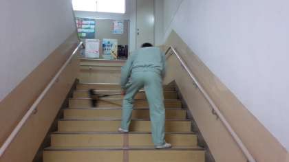 いつものように、管理作業員さんが1時間目のうちに、階段、廊下をモップで拭いてくださっています。