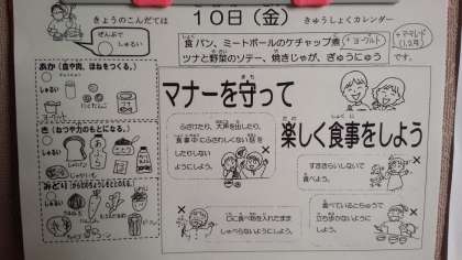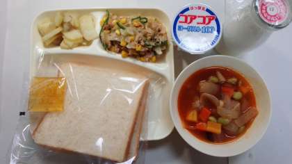 本日の献立は、ミートボールのケチャップ煮、ツナと野菜のソテー、焼きじゃが、食パン、マーマレード、ヨーグルトです。