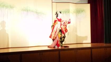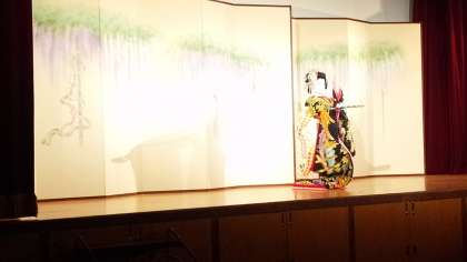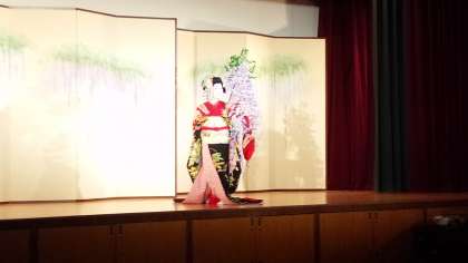 先ほど女方のお化粧の解説をしていただいた俳優さんが、舞台の上で、歌舞伎舞踊「藤娘」を演じてくださいました。