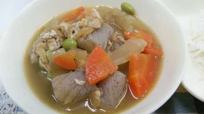 お魚と汁物をアップで掲載しました。汁物にはたくさんの野菜が入っています。