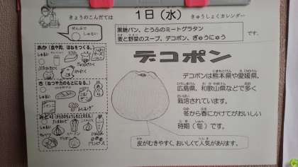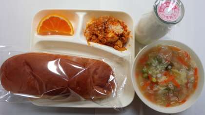 本日の献立は、とうふのミートグラタン、麦と野菜のスープ、黒糖パン、デコポンです。