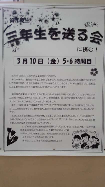 下の写真は、1年生廊下の「三年生を送る会」のポスターです。素晴らしい送る会になることを期待しています。