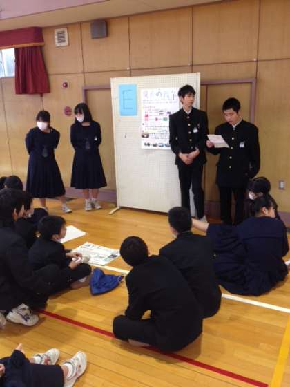 班長を中心に、班員が体育館の中で役割を決め、説明をしたり、質問を受けて答えるなどをしました。
