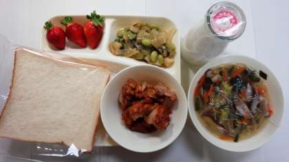 本日の献立は、ピリからあげ、中華スープ、ほたて貝と野菜のいためもの、いちご、食パンです。