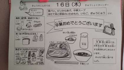 小学校6年生の皆さんの「卒業祝い献立」ということで、大変盛りだくさんで、お腹いっぱいになりました。