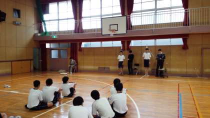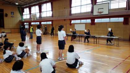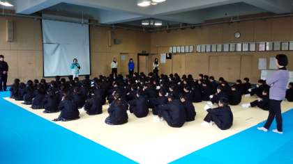 上の写真は、1年生の武道場での学年集会の様子です。