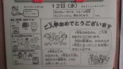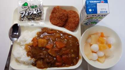 本日の献立は、ご入学お祝い献立で、カツカレーライス、フルーツ白玉、ミニフィッシュです。