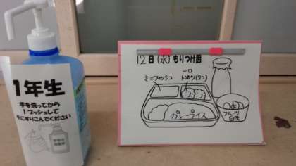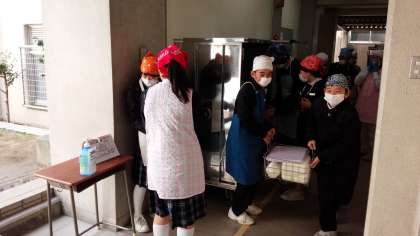 1,2年生の給食当番は、配膳室前に給食を取りに行きます。