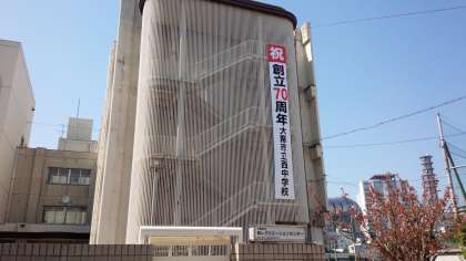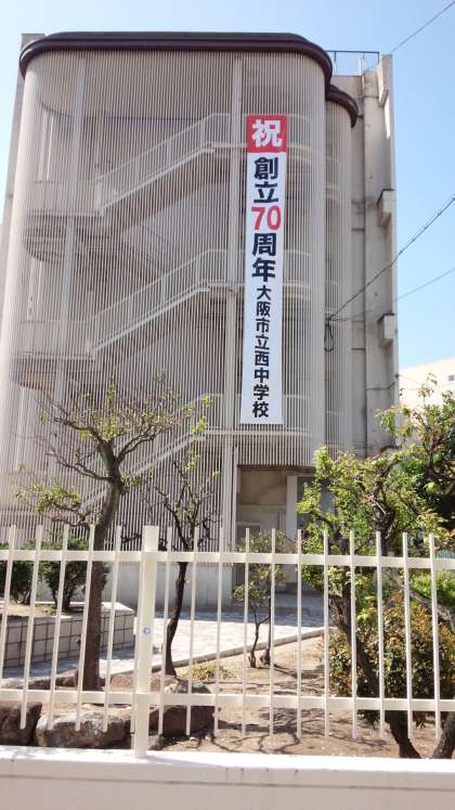 「創立70周年記念事業委員会」で垂れ幕をつくっていただき正門側非常階段に吊るしました。