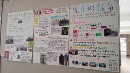 授業参観にお越しの際には、2年生の3学期に取り組んだ、修学旅行の調べ学習の成果を、3年生廊下に掲示していますので、ぜひご覧ください。