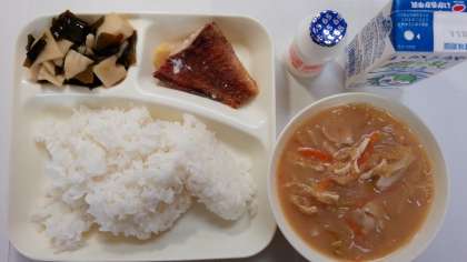 本日の献立は、赤魚のしょうゆだれがけ、みそ汁、わかたけ煮、発酵乳です。