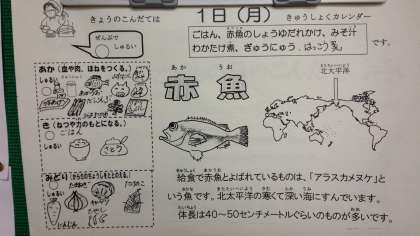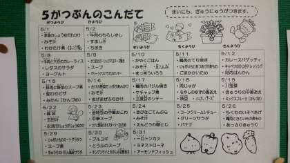 職員室前の掲示板に、ご覧の、日々の献立と、毎月分の献立表を掲示しています。