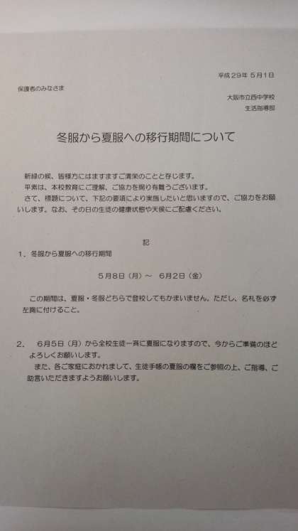 冬服から夏服への移行期間について