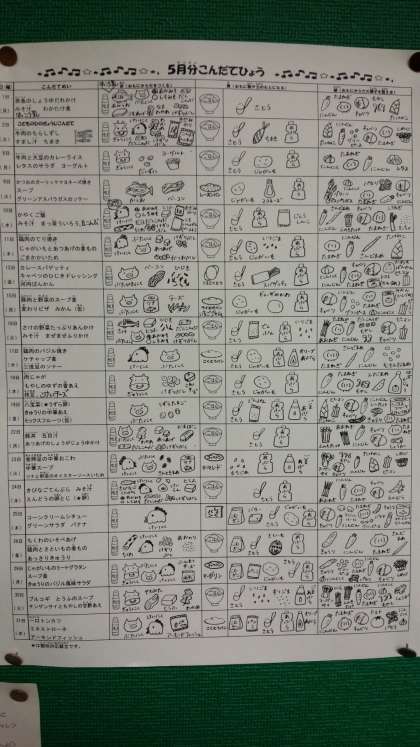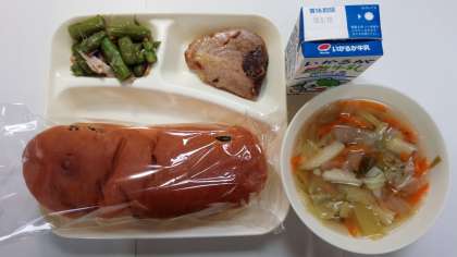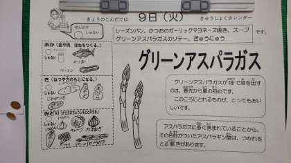 本日の献立は、かつおのガーリックマヨネーズ焼き、グリーンアスパラガスのソテー、スープ、レーズンパンです。