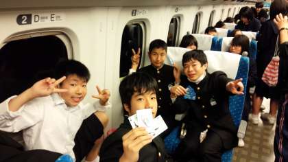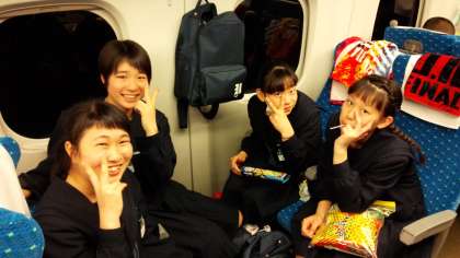 新大阪駅での出発式を終えて、ホームへ移動し、8時18分新大阪駅発の新幹線に、全員無事乗り込みました。写真は、新幹線の車内で楽しそうに過ごしている生徒たちの様子です。10時過ぎには、少し早い時間ではありますが車内で昼食をとり、10時47分にはJR博多駅に到着する予定となっています。