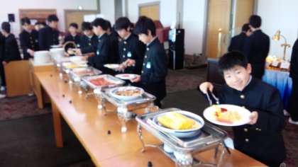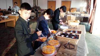 6時起床の後、部屋の片づけをして、制服に着替えたら、レストランで朝食です。本日の朝食もバイキングで、食事班がそろい次第、それぞれのテーブルで朝食をとりました。この後は、退館式を終えたら、バスに乗車して、8時過ぎには出発です。