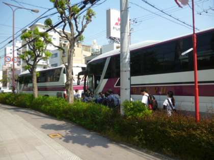 (写真は、出発式及びバスに乗車している様子です。)