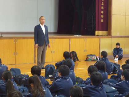 (写真は、校長先生のお話、生徒代表挨拶の様子です。)