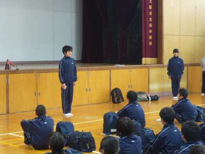 歌の練習の後は、出発式を行いました。校長先生からは、全員がそれぞれの役割分担を自覚して活動すること、公共交通機関を利用するうえでの社会的なマナー、等についてお話があり、明日学校に戻ってきたときには中学生として成長した姿を見せてほしいという言葉ありました。生徒代表からも、一泊移住を成功させましょうと力強い挨拶がありました。