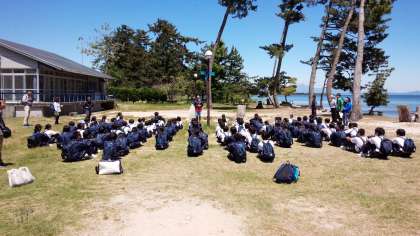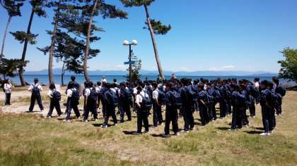 全員とても元気で、無事にびわこ青少年の家に到着しました。松林に集合・整列し、入所式を行いました。生徒代表が挨拶をして、青少年の家の方のお話を聞きました。