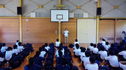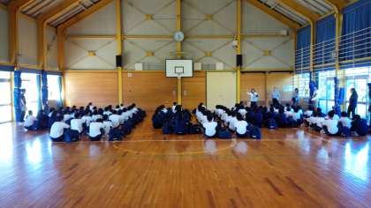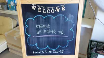 ウェルカムボードが用意されていました。全員で体育館に入館して、施設の方からオリエンテーションを受けました。