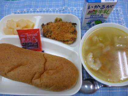 本日の献立は、ライ麦パン、いちごジャム、カレードリア、キャベツのスープ、白桃です。