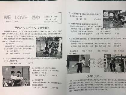 本日、1年生に学年だよりを配布しました。一泊移住から引き続き先週の金曜日に行われた室内オリンピックの様子が伝わる内容となっておりますのでぜひチェックしてください。ちなみに3組が優勝しました。よく頑張りました。