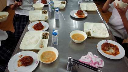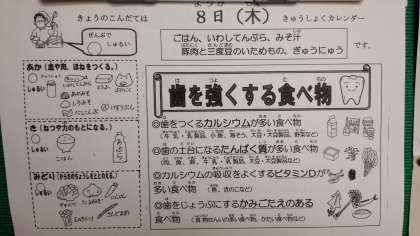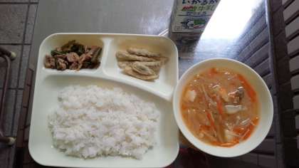 本日の献立は、いわしのてんぷら、豚肉と三度豆のいためもの、みそ汁です。